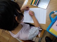 お世話をした後には、教室で花の色や数を記録していました。アサガオを大切に育てている子どもたちの姿に感心させられます。