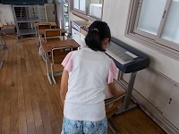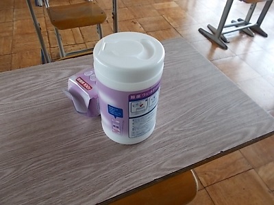 通常は、机ふき係の児童が全員の机をぞうきんがけをするのですが、万が一、感染している児童がいた場合、ぞうきんがけではウイルスを他に広げることにつながります。そのため、下にあるような除菌シートを全ての教室に配置し、自分の机の汚れは自分でふき取るようにしています。