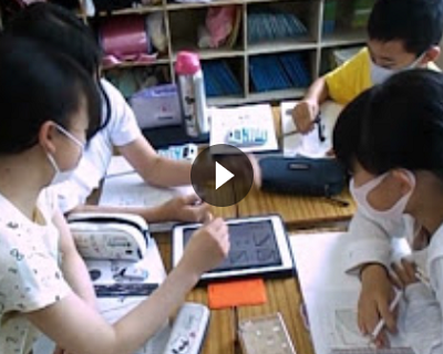 一人1台タブレットを操作させるのではなく、グループに1台とすることで、一つの図形(ipad)をグループの子どもたちが囲み、その図形を指でつつきながら、「〇〇かな?」「△△じゃない?」などと話し合う姿が見られました。それはまるで寄せ鍋を囲みながら会話を弾ませているようでした。