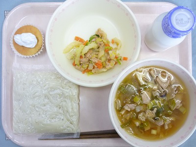 越津ねぎ入り肉うどん 牛乳 白菜とツナの煮びたし カップケーキ