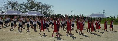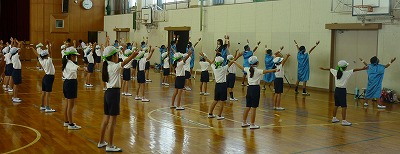 体育館に白組、運動場に赤組が集まり、