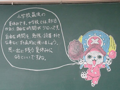 明日から子どもたちは、夏季休業に入ります。当たり前のことではありますが6年生にとって、明日からの夏季休業は従来と異なり、小学校における最後の「夏休み」です。新型コロナウイルス感染症の「第7波」の真っただ中ではありますが、「やってみよう」「やりたい」ことにチャレンジする夏休みにしてほしい、そんな願いを込めて担任が黒板アートを描きました。