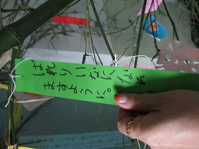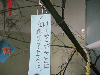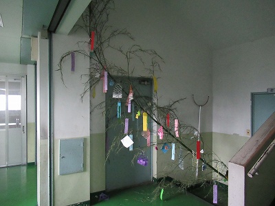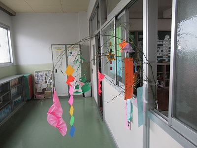 今日は、7月7日 七夕の日です。低学年の廊下には、願いを書いた短冊や飾りが結ばれた大きな笹が、あいにくの空模様を跳ね返すように立っています。