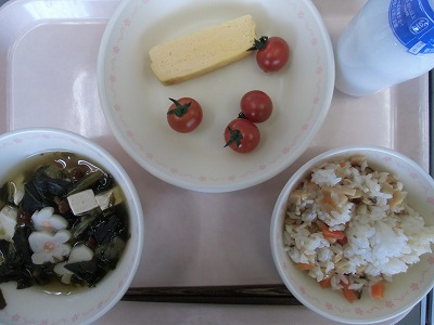 牛乳 はるのまぜごはん たまごやき ミニトマト おすいもの