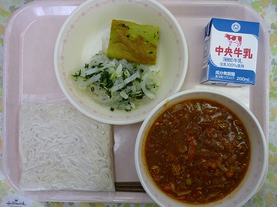 ソフト麺 牛乳 ミートソース 大根サラダ 抹茶ケーキ