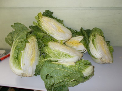 今日は白菜の収穫を行いました。下の写真のように、白菜がとっても立派に育ちました。一人半分に分けたものを持ち帰ります。