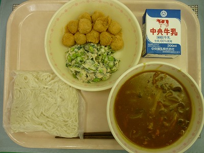 カレーうどん 牛乳 枝豆と空芯菜のサラダ わらび餅