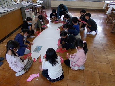 2年生の子どもたちは学習発表会に向けて大道具の制作を行ってました。