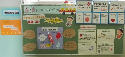 保健室前の廊下には、救急のときに大切になる、血液についての