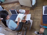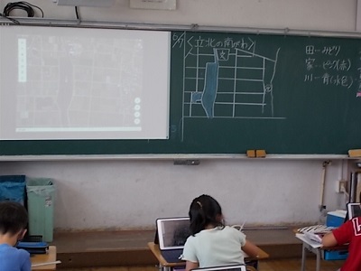 一人1台タブレットでグーグルの地図を開き、航空写真で学校の周りの様子を調べ、ノートに田や家、川などに色を塗りまとめていました。