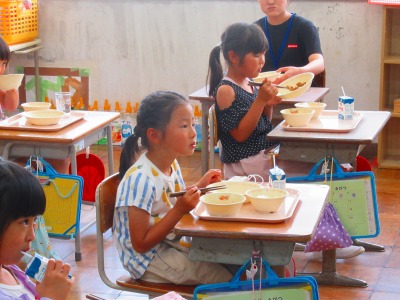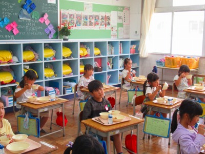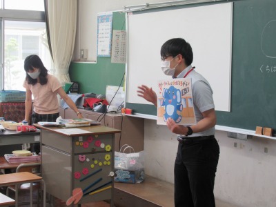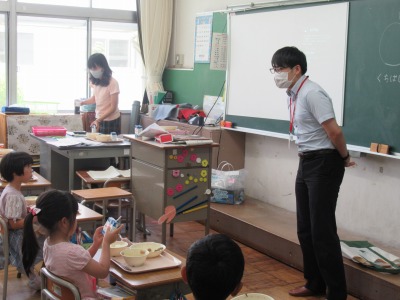 給食センターの栄養教諭 津原先生に来校いただき、1年生の栄養指導を行っていただきました。小学校での給食がスタートし2か月経った1年生に、改めて給食のマナーや約束について、紙芝居を使ってお話ししていただきました。食べながらお話を聞くので、初めに「声を出さずに聞いてくださいね」と先生からお願いがありましたが、全員がきちんと約束を守り、おしゃべりせず、うなずいたり、箸を止めて紙芝居に見入ったりしながら真剣にお話を聞くことができました。