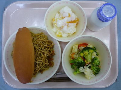 小型ロール 牛乳 焼きそば 花野菜サラダ フルーツババロア
