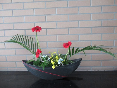 正面玄関に、素敵な花が飾られました。ガーベラ、オンシジューム、オキシペタラムなどのかわいい花々が、クールな花器に生けられています。見に来てくださいね。
