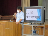 今日は夏休み前最後の朝礼でした。校長先生から「八つのすてきな言葉」の紹介がありました。「八つ」は本校の学級数です。各学級で、年度当初に担任と子どもたちが話し合い決めた学級目標が紹介されました。
