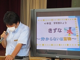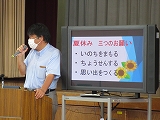 最後に、明日からの夏休みは自分で自分の「いのちをまもる」「ちょうせんする」「思い出をつくる」3点について努力するようお話しいただきました。