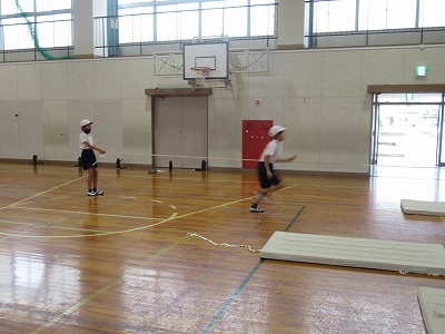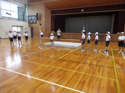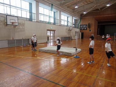 体育の時間に4年生は体育館で、高跳びの練習をしました。60㎝、70㎝、ゴムによる練習と3か所に分かれ、自分の今のレベルに合わせて練習に取り組みました。