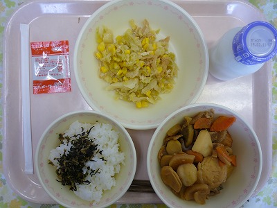 ごはん 牛乳 味噌おでん きゃべつの煮和え 手作りふりかけ
