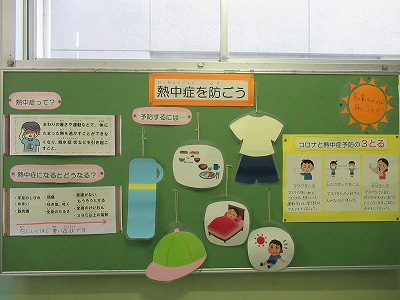 7月の保健室廊下掲示です。熱中症とはどういう症状?コロナと熱中症両方を予防するための「3とる」とは?など役に立つ知識を楽しく学ぶことができます。