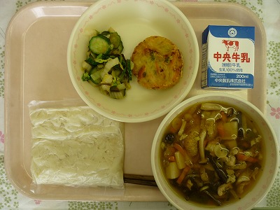 山菜きしめん 牛乳 玉ねぎと桜えびのから揚げ