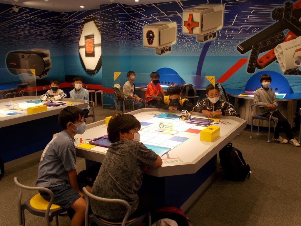 最初にプログラミングの体験をしました。学校でもプログラミングの勉強はしていますが、実際にロボットにプログラミングで命令を出して操作できたので、とても楽しそうに取り組んでいました。