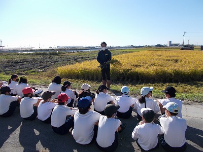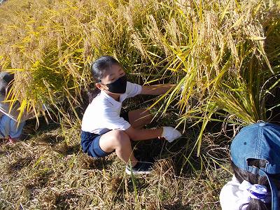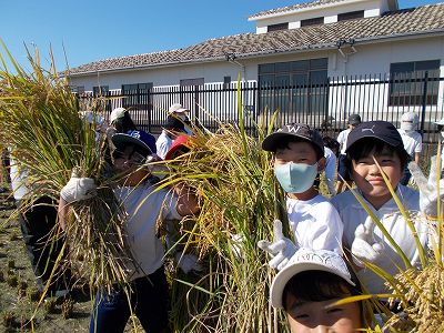 5年生が春に田植えをした稲が立派に実り、秋晴れの中、稲刈り体験をしました。