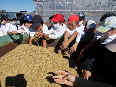 田んぼの管理をして頂いている戸倉トラクターの横井さんから稲の刈り方や注意事項を教えていただきました。はじめに、田んぼの周囲を機械で刈り取っていただき、田んぼの真ん中の稲を5年生と保護者ボランティア、戸倉トラクターの応援の方々で鎌で刈り取りました。刈り取った稲が機械で脱穀される様子も見ることができました。