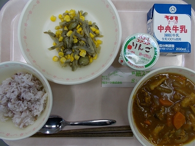 牛乳 ごこくごはん あきのみかくカレー ごぼうサラダ りんごヨーグルト 今日のカレーは、れんこん、しめじ、まいたけ、マッシュルーム、さつまいもなど秋の味覚がたくさん入ったカレーでした。