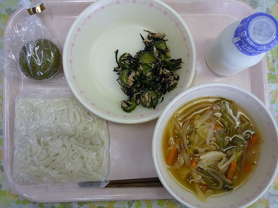 五目うどん 牛乳 ひじきサラダ 抹茶蒸しパン