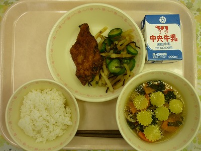 ごはん 牛乳 トロアジの竜田揚げ 塩こんぶ和え 重陽の節句汁