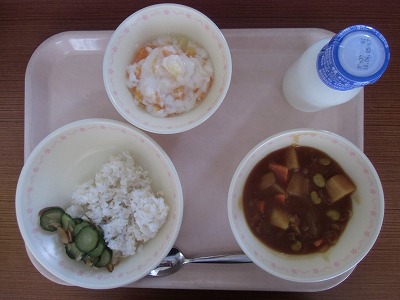 むぎごはん 牛乳 カレーライス ふくじんあえ フルーツババロア