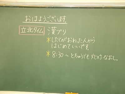下の映像の子どもたちの様子は8時20分ごろのものです。立北タイムは8時25分から始まるのですが、雨天ということもあり、多くの子どもたちが時刻より前に取り組んでいました。梅雨が続きますが、落ち着いて校内で時間を過ごすことができています。担任の先生方の日頃の指導に感謝です。