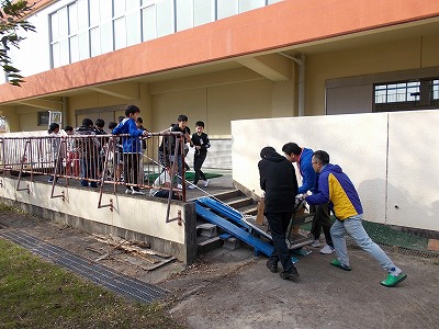 体育館へ臼を運び入れたり、もち米を洗ったりしました。