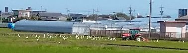 トラクターのまわりには、たくさんのサギが集まってきて、