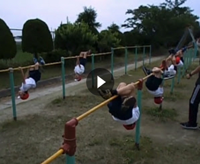 今日は「ぶたの丸焼き」というぶら下がりを15秒間続けることに挑戦していました。力の限りぶら下がる子どもたちの姿が印象的でした。