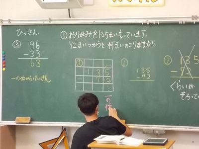 担任の先生は、間違いをなくすために位をそろえてノートに立式することを、ていねいに子どもたちに確認していました。