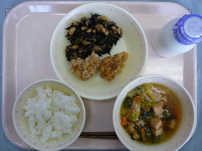 ごはん 牛乳 鶏の唐揚げ ひじきの炒め煮 えび入りなると汁