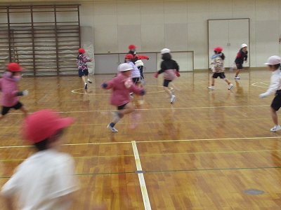 外ではみぞれが降りしきり、体育館の戸や窓は解放されていて、体育館の中はまるで冷蔵庫の中のような寒さです。そんな中、1年生は元気いっぱいに、紅白対抗しっぽとりを体育の時間に取り組みました。はじめは防寒着を着て取り組んでいましたが、すぐに体がポカポカしたのか、上着を脱いだり水分補給をしたりしながら、楽しそうに走り回っていました。