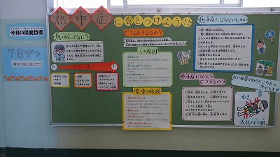 保健室前の廊下に、熱中症を予防する方法が、詳しく書いてあります。