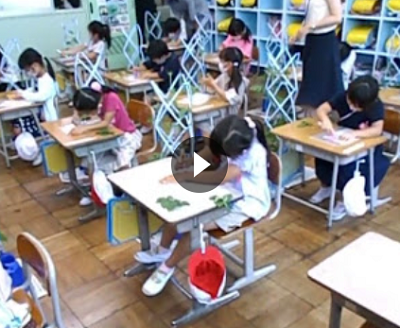 1年生の子どもたちは生活科の授業でアサガオの葉を使って、模様づくりをしていました。自分たちが大切に育てているアサガオの葉を数枚とり、紙に挟んでていねいにこすることで葉っぱの模様を浮き上がらせていました。この後は、花で色水も作るそうです。そういった活動を行うことで、植物が成長する様子や変化、不思議さに子どもたちは強い関心をもってくれることと思います。