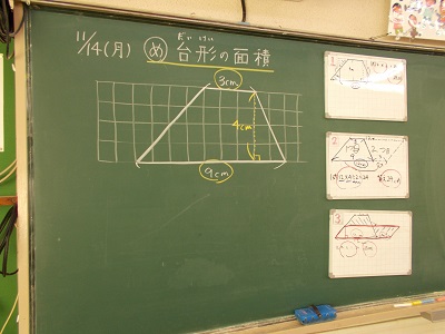 様々な方法で台形の面積を求めた後、その求め方をヒントに席が近い子ども同士で話し合いながら台形の面積を考えています。意欲的に取り組む子どもたちの姿が見られました。