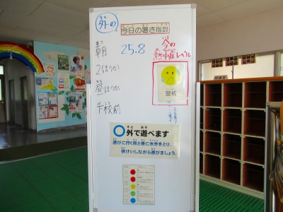 今週は梅雨とは思えないような晴天が続いています。それに伴い、気温がぐんぐん上昇し熱中症の危険性が高くなってきました。学校では、朝・2時間目後の休み時間・昼休み・下校の時に熱中症指数を計測し、児童玄関や職員室に表示して注意喚起をしています。本日は朝から「警戒」レベルです。指数が上昇し「危険」レベルに達すると外での運動や活動を制限します。