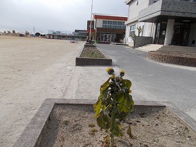 運動場の花壇で成長していたヒマワリは、とっても寒い中、