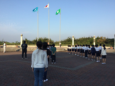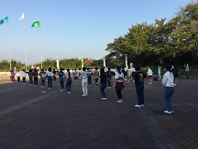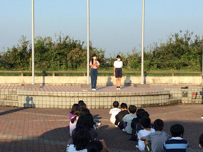 7時からの朝の集いでは立田南部小学校のみなさんと学校紹介をしたり、みんなでラジオ体操をしたりしました。