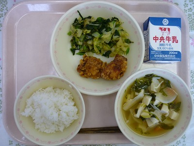ごはん 牛乳 鶏のから揚げ 磯香和え みつばのすまし汁