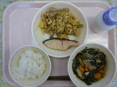 ごはん 牛乳 鮭の塩焼き ゴーヤチャンプルー もずく汁