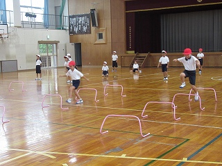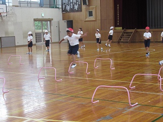 2年生は、2時間目の体育の時間に体育館で、間隔をあけて置いた小さな障害物をリズミカルに跳んでいく運動を行いました。小さな障害物は、柔らかい素材でできており、足に当たっても痛くありません。コロナや熱中症のため運動する機会が少ない今、跳ぶ、走るなど基本動作を楽しく身に付ける機会を増やしていきたいと思います。