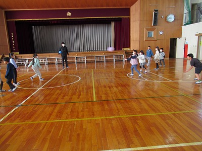 2年生は体育館でドッチボールをしていました。お天気は良いですが、気温がとても低く、体育館の中はまるで冷蔵庫の中を思わせるような寒さです。2年生の中には半袖Tシャツとハーフパンツの服装の男子もいて、元気いっぱい、楽しそうに活動していました。