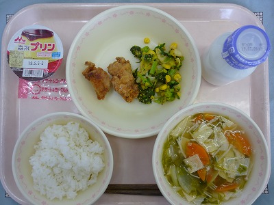 ごはん から揚げ おひたし 湯葉とめかぶのすまし汁 プリン