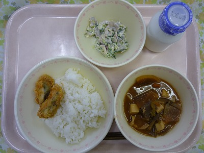 ごはん 牛乳 白身魚のフリッター れんこんの梅マヨサラダ ぶた汁