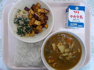 和風カレー麺 牛乳 春菊とツナの和え物